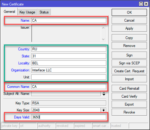 2add name=ovpn-server country="RU" state="31" locality="BEL" organization="Interface LLC" common-name="ovpn-server" key-size=2048 days-valid=3650 key-usage=digital-signature,key-encipherment,tls-server