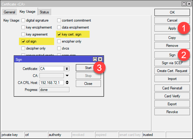 Перейдем на закладку Key Usage и укажем crl sign и key cert. sign, остальные флаги следует снять, затем нажмем кнопку Apply, применив изменения и подпишем сертификат нажав Sign. В открывшемся окне следует указать адрес, на котором будет опубликован список отозванных сертификатов - CRL, если это будет единственный OpenVPN сервер, то можно указать 127.0.0.1, иначе лучше указать один из реальных адресов роутера, в нашем случае внутренний. После чего нажимаем Start и дожидаемся окончания процесса подписи.