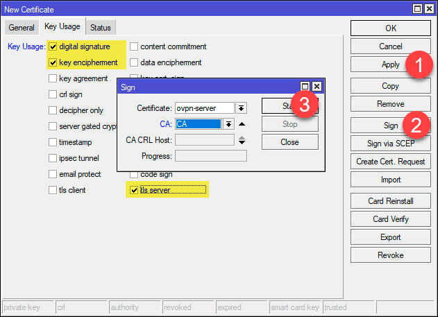 Затем выпустим ключевую пару сервера. Закладка General нового сертификата заполняется аналогично, только в полях Name и Common Name указываем ovpn-server (или любое наименование на свое усмотрение). На вкладке Key Usage указываем digital-signature, key-encipherment и tls-server. Затем подписываем сертификат, для этого в поле CA выбираем созданный ранее сертификат CA.