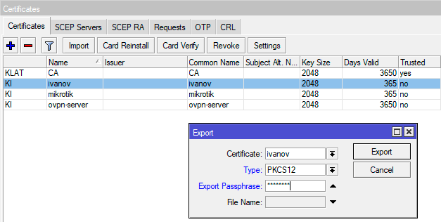 Если все сделано правильно, то корневой сертификат будет иметь флаги KLAT, а остальные - KI. Для передачи клиентам мы должны экспортировать: сертификат CA, сертификат клиента, закрытый ключ клиента. Для этого лучше всего использовать формат PKCS12, позволяющий разместить все сертификаты и ключи в одном контейнере.