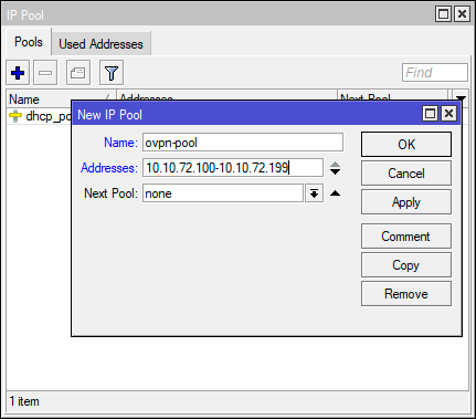 Начнем с создания пула адресов для выдачи клиентам, для этого перейдем в IP - Pool и создадим новый пул адресов ovpn-pool, в нашем случае будет использоваться диапазон 10.10.72.100 - 10.10.72.199.