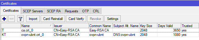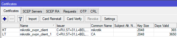 Сертификаты и ключи требуется предварительно загрузить в роутер в разделе Files. Затем их можно импортировать в System - Certificate кнопкой Import. Если все сделано правильно, то корневой сертификат будет иметь ключ T (LT), а сертификат сервера - KT.