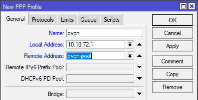 Затем перейдем в PPP - Profiles и создадим новый профиль. Укажем его имя Name - ovpn, локальный и удаленный адреса: Local Address - 10.10.72.1, Remote Address - ovpn_pool. На всякий случай напомним, что локальный адрес должен принадлежать той-же /24 сети, что и диапазон пула адресов.