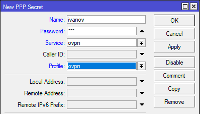2add name=ivanov password=123 profile=ovpn service=ovpn