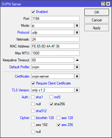 2 add auth=sha256 certificate=mikrotik_ovpn_client cipher=aes256-cbc \
