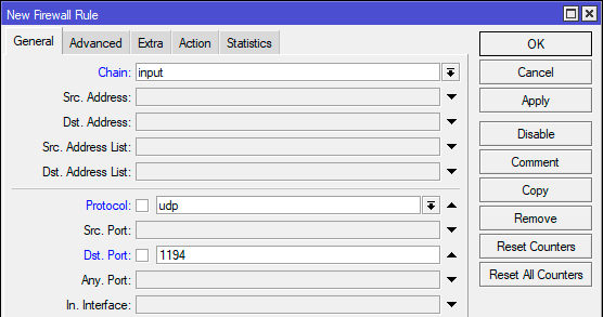 На этом настройка OpenVPN сервера закончена, осталось разрешить входящие подключения к нему. Откроем IP - Firewall и добавим правило: Chain - input, Protocol - udp, Dst. Port - 1194. Действие можно не указывать, так как по умолчанию применяется accept.