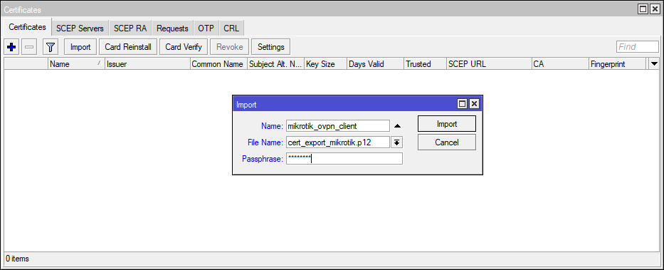 2import file-name=cert_export_mikrotik.p12 passphrase=12345678 name="mikrotik_ovpn_client"