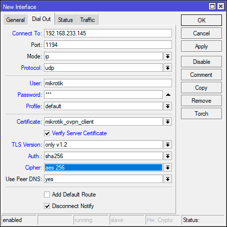 Затем перейдем в PPP - Interface и создадим новый интерфейс типа OVPN Сlient. В поле Connect To указываем адрес OpenVPN сервера, Port - 1194, Mode - ip, Protocol - udp. Ниже указываем учетные данные, созданные для этого пользователя на сервере. Параметры шифрования указываем аналогично тому, что вы выбрали на сервере. В поле Certificate выберите сертификат клиента, также можно установить флаг Verify Server Certificate для большей безопасности.