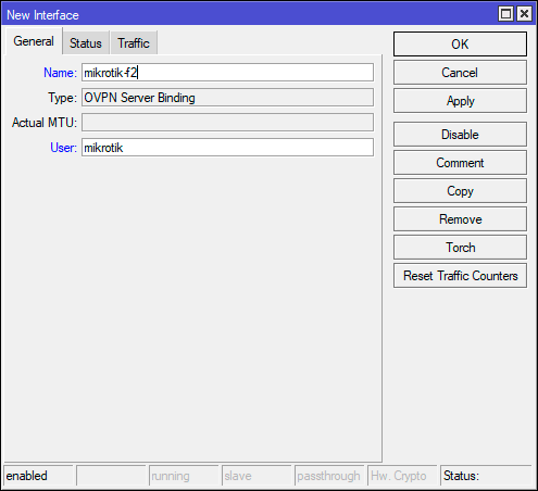 По умолчанию для подключившегося клиента создается динамический интерфейс, настроить маршрутизацию для него нельзя, поэтому создадим статический интерфейс и привяжем к нему подключения от данного клиента. Перейдем в Interfaces и создадим новый интерфейс типа OVPN Server Binding. В настройках укажем желаемое имя, Name - mikrotik-f2, в поле User - укажем пользователя, подключение которого будет привязано к этому интерфейсу - mikrotik.
