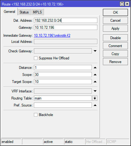 2add disabled=no dst-address=192.168.232.0/24 gateway=10.10.72.194 routing-table=main suppress-hw-offload=no