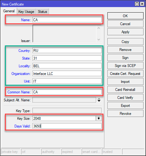 Сначала выпустим корневой сертификат, для этого перейдем в System - Certificate и создадим новый сертификат заполнив поля как указано на рисунке, красным обозначены обязательные к заполнению.