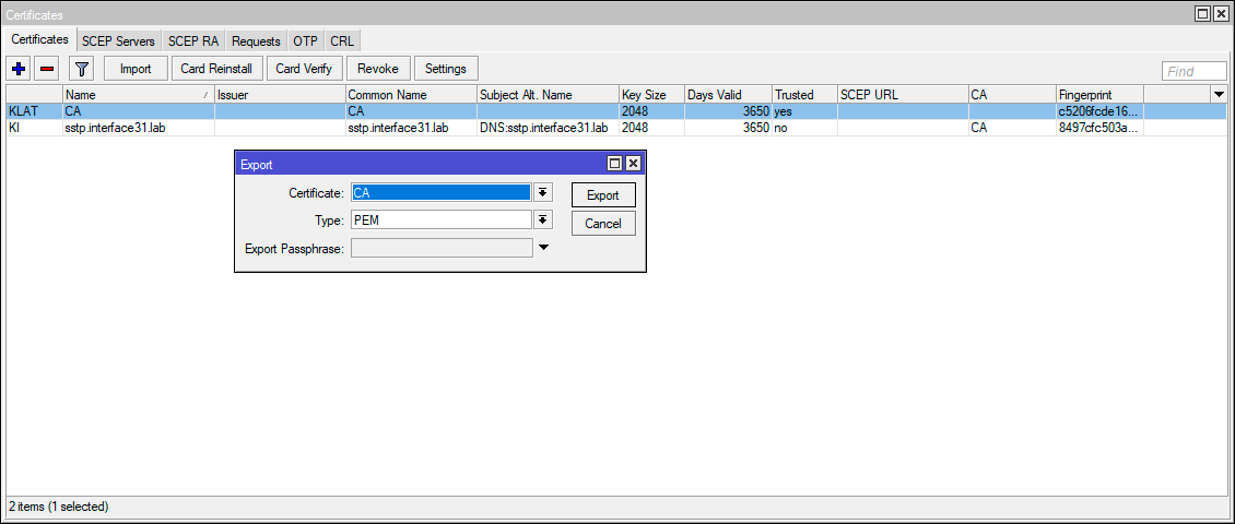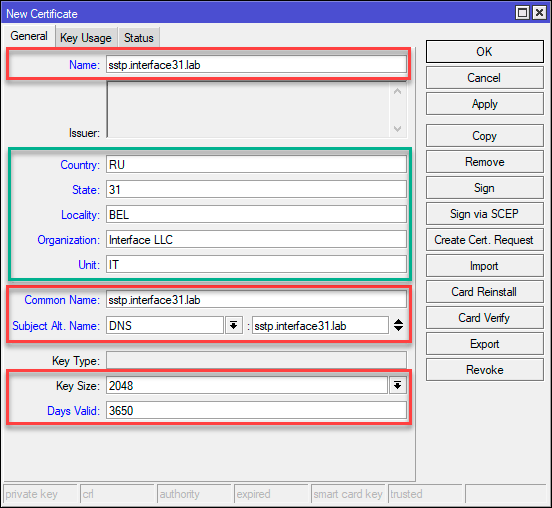 2add name=sstp.interface31.lab country="RU" state="31" locality="BEL" organization="Interface LLC" common-name="sstp.interface31.lab" subject-alt-name=DNS:"sstp.interface31.lab" key-size=2048 days-valid=3650 key-usage=digital-signature,key-encipherment,tls-server