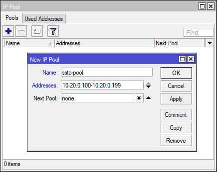 2add name=sstp_pool ranges=10.20.0.100-10.20.0.199
