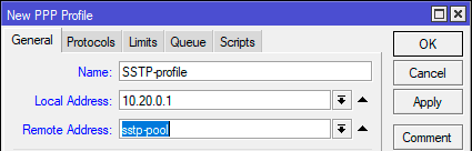 2add local-address=10.20.0.1 name=SSTP-profile remote-address=sstp-pool