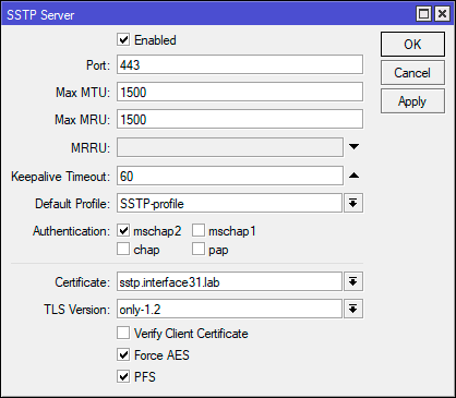 2set authentication=mschap2 certificate=sstp.interface31.lab default-profile=SSTP-profile enabled=yes force-aes=yes pfs=yes tls-version=only-1.2