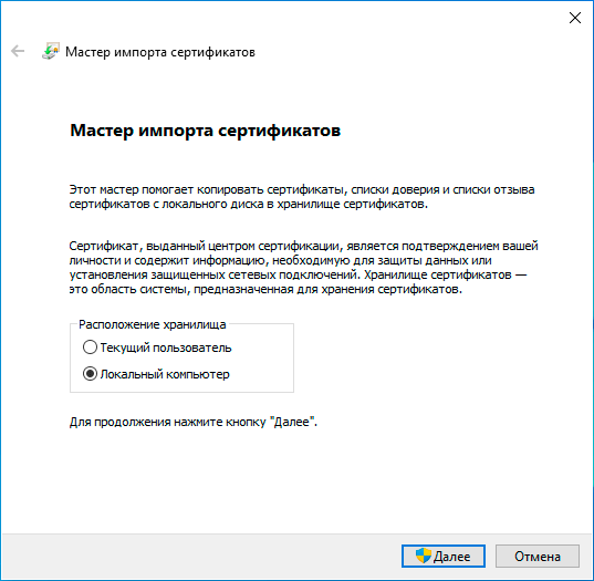 Как мы уже говорили, для того чтобы клиент мог проверить подлинность сервера нам необходимо импортировать корневой сертификат, переместим его на клиента и установим в Расположение хранилища - Локальный компьютер: