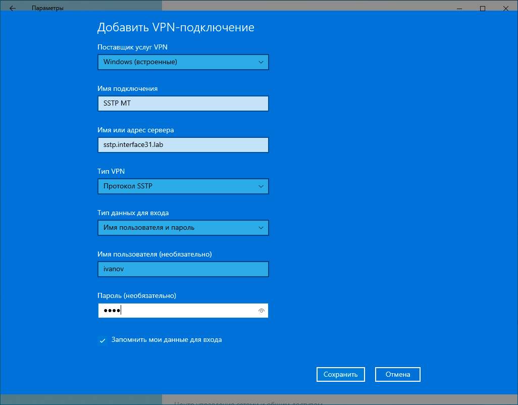 Затем создаем подключение, в котором указываем Тип VPN - Протокол SSTP и Тип данных для входа - Имя пользователя и пароль, здесь же вводим адрес сервера и учетные данные.