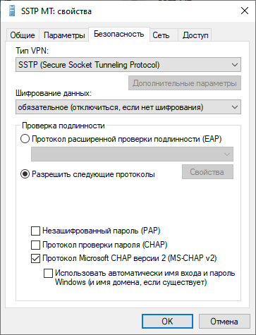 После чего в свойствах подключения на закладке Безопасность убедимся, что в разделе Проверка подлинности указан только протокол MS-CHAP v2.