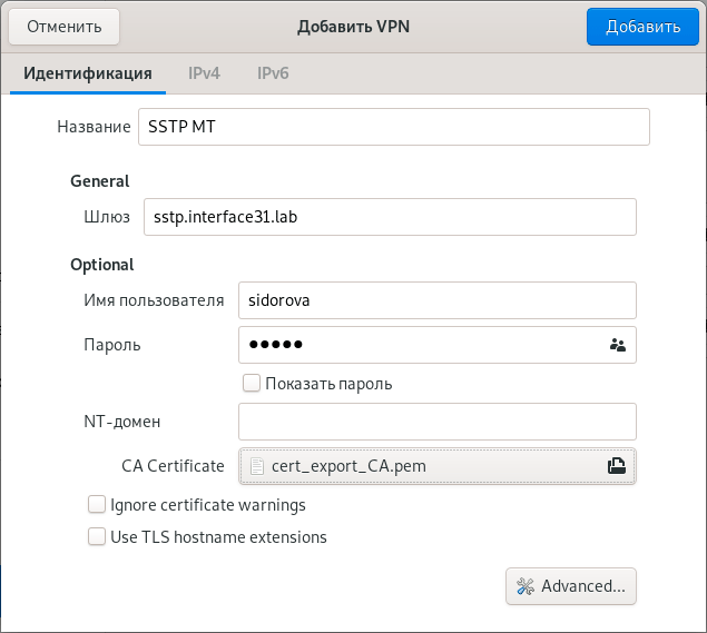 После чего появится возможность создать SSTP-соединение штатными средствами Network Manager. Настройки несложные: указываем адрес сервера, учетные данные и сертификат CA, у которого предварительно следует изменить расширение на PEM.