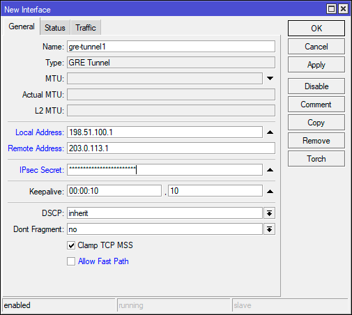 2add allow-fast-path=no ipsec-secret=MyIP$ecret123 local-address=198.51.100.1 name=gre-tunnel1 remote-address=203.0.113.1