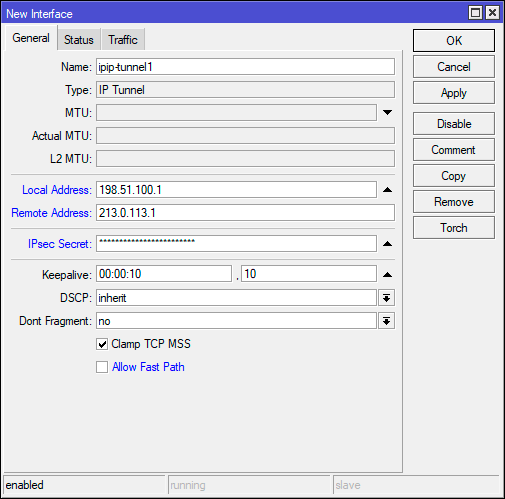 2add allow-fast-path=no ipsec-secret=MyIP$ecret123 local-address=198.51.100.1 name=ipip-tunnel1 remote-address=203.0.113.1