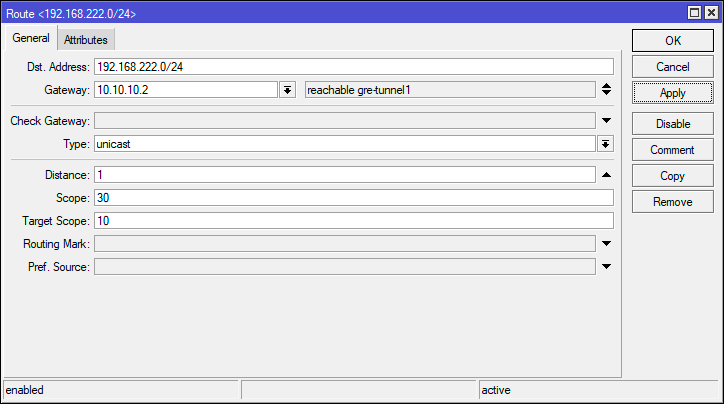 Теперь приступим к указанию маршрутов, для роутера A нам нужно указать маршрут к сети 192.168.222.0/24 через туннель. Переходим в IP - Routes и создаем новый маршрут. В качестве Dst. Address указываем сеть назначения - 192.168.222.0/24, в поле Gateway указываем шлюз в эту сеть - противоположный конец туннеля, который имеет адрес 10.10.10.2, после того как мы нажмем Apply в поле рядом со шлюзом появится исходящий интерфейс, в качестве которого будет выступать наш туннель.