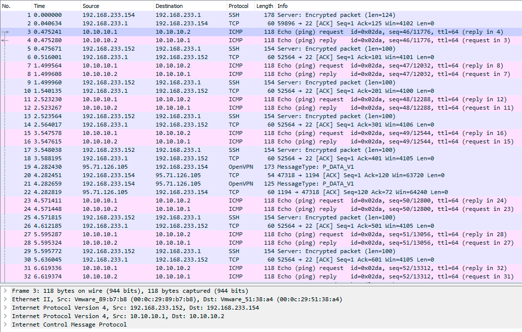 После того как вы настроите IPsec на одной стороне связь с другой стороной пропадет и появится только после аналогичной настройки удаленного узла, только теперь наш туннель будет работать с защитой IPsec. Чтобы убедиться в том, что это именно так, можно изучить дамп трафика.