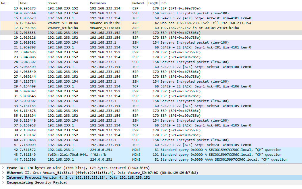 После включения IPsec картина будет иной, доступны будут только внешние IP-заголовки, остальное содержимое будет надежно зашифровано протоколом ESP, входящим в состав IPsec:
