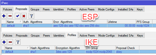 Поэтому оставим описанные варианты для опытных пользователей и настроим IPsec так, чтобы была возможность работать с роутерами Mikrotik из коробки. Что нужно учесть в этом случае? Прежде всего протокол обмена ключами - по умолчанию это IKEv1. Затем шифры, их набор существенно отличается от тех, которые мы использовали в настройках выше. Чтобы ознакомиться с ними перейдем в IP - IPsec и изучим данные на закладках Proposals и Profiles: