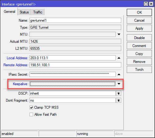 2add allow-fast-path=no ipsec-secret="My$ecret" !keepalive local-address=203.0.113.1 name=gre-tunnel1 remote-address=198.51.100.1