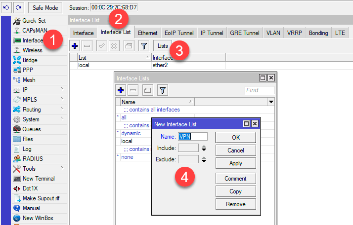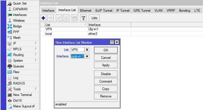 После чего создадим новый список интерфейсов и поместим в него все привязки. Откройте Interfaces - Interface List - Lists и создайте новый список, назовем его VPN.