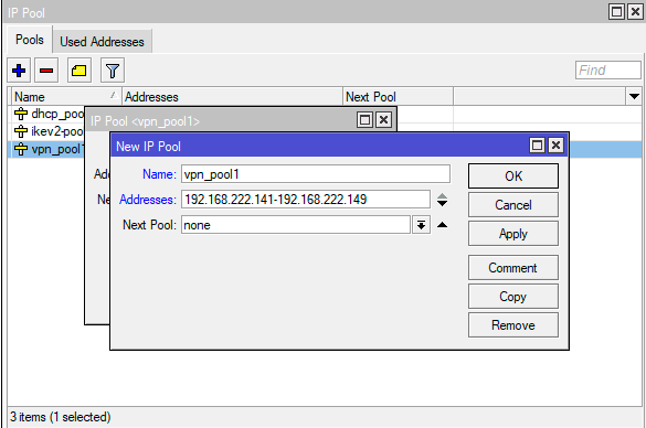 Теперь можно заняться изменением адресации. В нашем примере сеть офиса - 192.168.111.0/24, будем считать, что она пересекается с клиентскими сетями и поэтому для VPN-подключений мы будем отдавать виртуальную сеть 192.168.222.0/24. Перейдем в IP - IP Pool и изменим в пуле адресов, выдаваемом клиентам сеть с 111-й, на 222-ю. Вы можете как изменить существующий пул, так и создать новый.