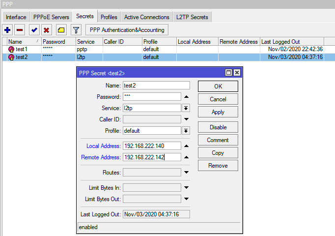 Если же адреса клиентов заданы непосредственно в настройках их учетных записей, то переходим в PPP - Secrets и исправляем адреса для каждой учетной записи клиента (при этом может быть задан только один - Remote Address, в этом случае Local Address будет взять из профиля).