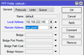 Потом откроем PPP - Profiles и открыв профиль, указанный для клиентов VPN-сервера, исправим в нем собственно адрес сервера - Local Address, также следует убедиться, что указанный пул адресов в Remote Address соответствует нужной подсети (в нашем случае 222-й).