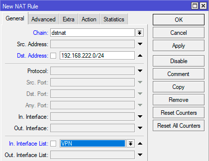 Если теперь мы выполним переподключение удаленного клиента, то он получит адрес из 222-й подсети, но доступа в сеть офиса у него не будет, так как мы еще не выполнили отображение этой сети, на локальную сеть офиса. Для этого перейдем в IP - Firewall - NAT и создадим новое правило. На закладке General укажем: Chain - dstnat, Dst. Address - 192.168.222.0/24, In Interface List - VPN, эти условия говорят, что данное правило будет применяться в цепочке dstnat (PREROUTING) к пакетам, пришедшим из привязанных интерфейсов списка VPN с адресом назначения в сети 192.168.222.0/24.