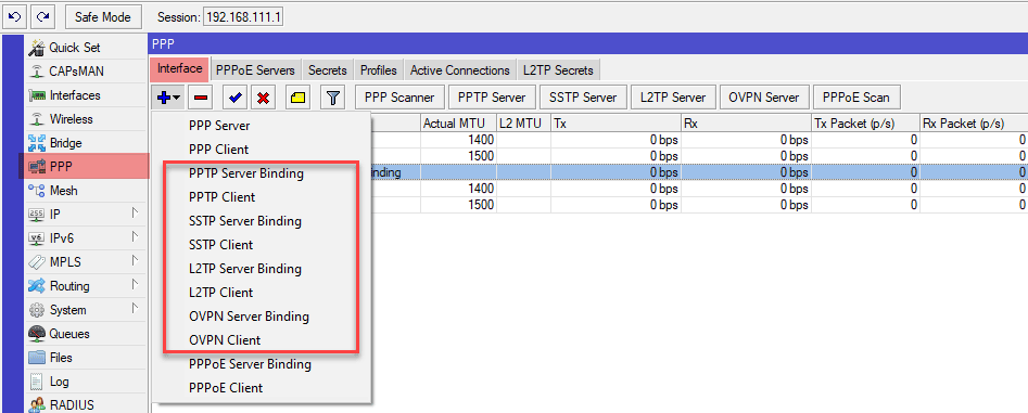 В рамках данной статьи мы будем рассматривать варианты настройки Mikrotik именно в качестве клиента для поддерживаемых типов VPN-серверов, оставив за кадром туннельные подключения (GRE, IP-IP, EoIP и т.д.). Для работы с этим типом соединений используется специальный раздел PPP, на закладке Interfaces которого можно добавить сетевой интерфейс для нужного типа VPN-клиента. Поддерживаются PPTP, L2TP, SSTP и OpenVPN подключения. Также в списке присутствуют устаревший PPP и PPPoE, который используется для организации доступа в интернет, в данном контексте эти протоколы интереса не представляют.