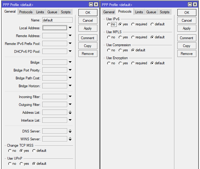 Единственным различием двух профилей является опция Use Encryption, которая в default-encryption установлена в положение yes и требует обязательного шифрования подключения. Данная опция игнорируется протоколами SSTP и OpenVPN, которые всегда используют шифрованные подключения.