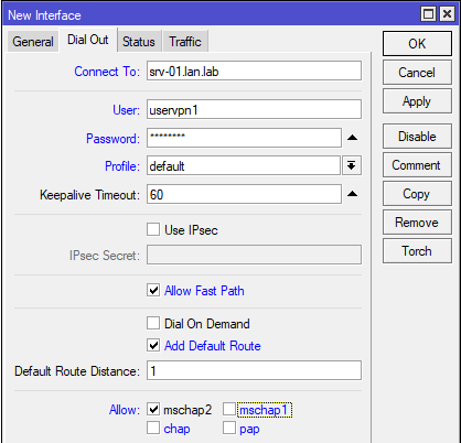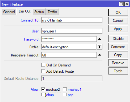 Также аналогичные действия можно выполнить и в разделе Interfaces, никакой разницы откуда вы будете добавлять сетевой интерфейс нет. Но не будем спешить и перейдем на закладку Profiles, где находятся профили используемые при коммутируемых подключениях. По умолчанию созданы два профиля: default и default-encryption, в которых содержатся некоторые настройки для подключения. Почему некоторые? Потому что большинство опций подключения задаются сервером и клиент должен применять именно их, иначе подключение будет невозможным. Поэтому если вы заглянете в эти профили, то увидите, что большинство настроек там не активно.