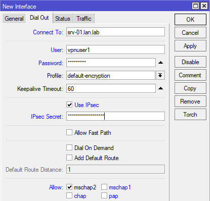 Для работы с L2TP/IPsec настройки будут немного иные, во-первых, используем профиль default-encryption и включаем использование IPsec установкой флага Use IPsec, при этом становится активным поле IPsec Secret, куда вводим предварительный ключ.