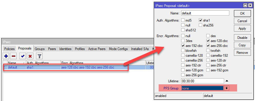 Вроде бы тоже ничего сложного в настройках L2TP/IPsec нет, но если вы попытаетесь подключиться к Windows Server, то у вас ничего не получится. В чем же дело? А дело в настройках IPsес, перейдем в IP - IPsec - Proposal и откроем настройку по умолчанию.Proposal или предложение IPsec содержит список алгоритмов защиты канала, которые устройство предлагает для установления соединения. Понятно, что для успешного установления канала поддерживаемые методы защиты должны совпадать.