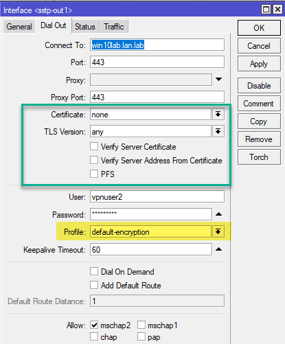 Также вспоминаем, что SSTP всегда использует шифрование канала, поэтому оно будет работать вне зависимости от выбранного профиля, в данном случае default и default-encryption будут работать одинаково.