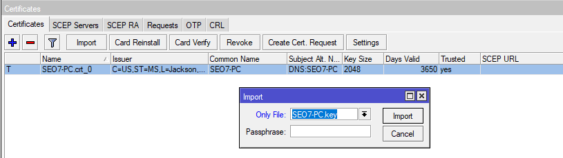 Прежде всего загрузим сертификаты и ключи на Mikrotik, затем перейдем в System - Certificates и импортируем сертификат клиента. Он появится в списке сертификатов и напротив него будет буква T, что обозначает trusted, т.е. устройство доверяет этому сертификату. Затем импортируем ключ, здесь важно соблюдать именно эту последовательность, сначала сертификат, потом ключ.