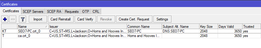После успешного импорта ключа флаги сменятся на KT, где буква K обозначает наличие закрытого ключа для сертификата. Затем аналогичным образом импортируем сертификат CA сервера, импорт ключа для данного сертификата не нужен. Закрытый ключ CA является самой большой тайной и должен хранится с соблюдением всех мер предосторожности и не при каких обстоятельствах не должен покидать узел СA (центра сертификации).