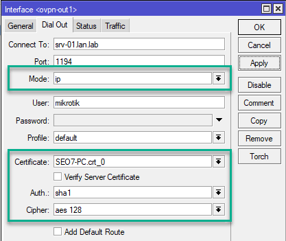 Mode задает режим работы канала, в терминах OpenVPN ip - это tun (L3), а ethernet - это tap (L2), следует помнить, что режим работы определяется сервером. В поле Certificate укажите импортированный сертификат клиента. Опции Auth и Cipher указывают на используемые сервером криптографические алгоритмы для аутентификации и шифрования, если вы укажете отличные от указанных в конфигурации сервера - то соединение установить не удастся. Если алгоритм аутентификации явно не указан в конфигурации сервера, то по умолчанию используется SHA1.