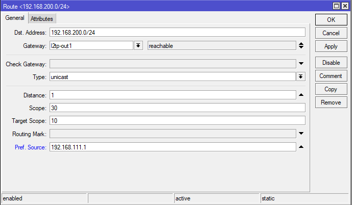 Отдельного внимания заслуживает опция Pref. Source, которая не является обязательной, но ее следует указывать, если роутер обслуживает несколько сетей, в ней указывается адрес, с которого роутер будет посылать пакеты по указанному маршруту. Без ее указания доступ роутера к ресурсам удаленных сетей может оказаться невозможным (как и удаленных сетей к нему), на работу клиентов в сетях это не влияет. В качестве значения следует указать адрес, принадлежащий той сети, к которой имеется маршрут с противоположной стороны (т.е. сети за сервером).