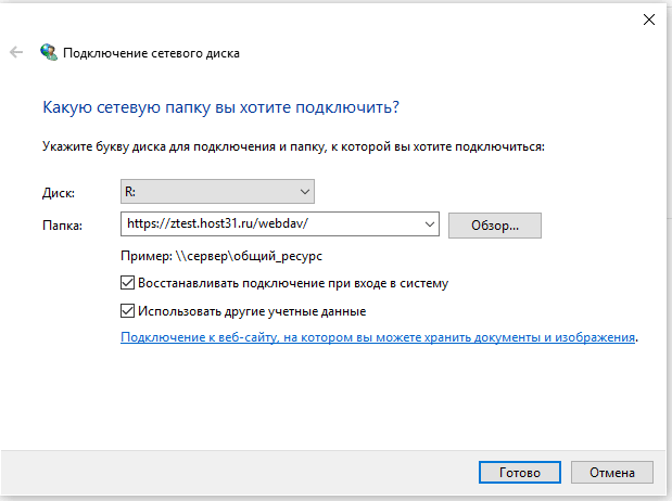 Для подключения WebDAV ресурса в файловую систему Windows просто выполните подключение сетевого диска с адресом сервера, не забудьте установить флаги Восстанавливать подключение при входе в систему и Использовать другие учетные данные.