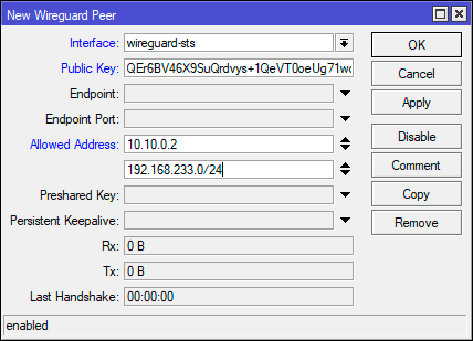 2add allowed-address=10.10.0.2/32,192.168.233.0/24 interface=wireguard-sts public-key="9pVP67ehKtQEr6BV46X9SuQrdvys+1QeVT0oeUg71wo="