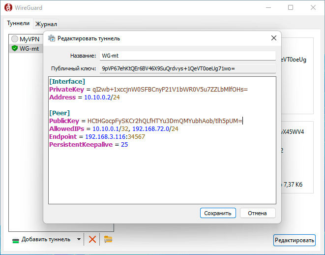 С другой стороны, у нас, допустим, будет Windows. Быстро настраиваем там новый туннель, в разделе Interface добавляем выделенный узлу адрес, а в разделе Peer указываем публичный ключ Mikrotik, его адрес и порт, а в разделе разрешенных адресов добавим адрес WireGuard интерфейса и сети за роутером.