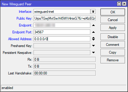 2add allowed-address=0.0.0.0/0 endpoint-address=x.x.x.x endpoint-port=34567 interface=wireguard-inet persistent-keepalive=25s public-key="kKxQ4wF+kUrpsTGwjMvlSwX45WV4nixG76/+sKlzEQA="