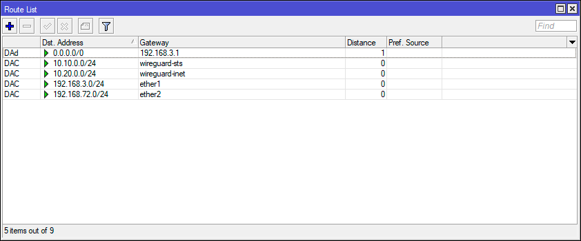 Перезапускаем службу и соединение будет установлено. Но трафик как шел через основного провайдера - так и идет. Почему так? Заглянем в таблицу маршрутизации, которая находится в IP - Routes, как видим нулевой маршрут как был через основного провайдера - так и остался. В отличие от официальных пакетов WireGuard, которые управляют маршрутами на хосте, в Mikrotik все отдано в руки администратора.